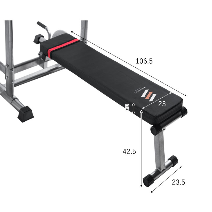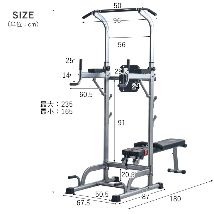 ▼ ベンチがないタイプもございます ▼ ▼ 他のタイプはこちら! ▼ 安心の耐荷重150kg 高強度!はしご型支柱 仕様 サイズ (ベンチ収納時)幅96×奥行91×高さ165〜235cm(ベンチ展開時)幅96×奥行180×高さ165〜235cm 【スタッフくっきーのおすすめポイント!】 ・高さは6段階から調整可能 ・耐荷重100kgの頑丈設計 ・1台で全身トレーニング ・自宅で本格的なトレーニングが可能 ・ぶら下がるだけで簡単エクササイズ ・さらに徹底したトレーニングを可能にするベンチ付き 素材 スチール・カーボンスチール・PVC・PP 重量 約26kg 耐荷重 ぶら下がり部:約100kgベンチ:100kgバーベルスタンド:100kg 生産国 中国 梱包サイズ 1/2:13.5×41.5×135.5cm2/2:14×26.5×112cm 送料【送料無料(北海道・沖縄県・離島は送料別途)】※北海道・沖縄県・離島の場合はお問い合わせください。