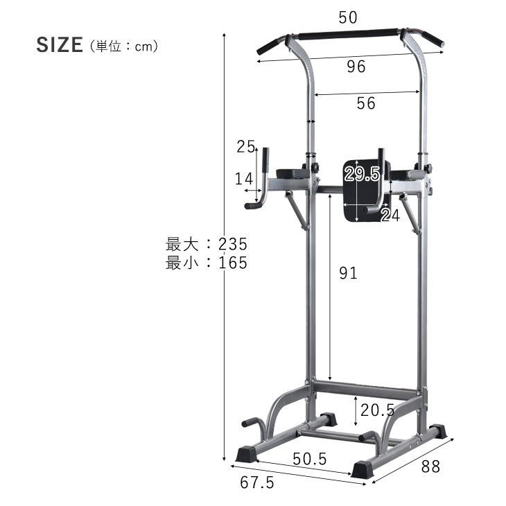 ▼ もっと鍛えられる!ベンチ付きはこちら ▼ ▼ 他のタイプはこちら! ▼ 安心の耐荷重150kg 高強度!はしご型支柱 仕様 サイズ 幅96×奥行88×高さ165〜235cm 【スタッフくっきーのおすすめポイント!】 ・高さは6段階から調整可能 ・耐荷重100kgの頑丈設計 ・1台で全身トレーニング ・自宅で本格的なトレーニングが可能 ・ぶら下がるだけで簡単エクササイズ 素材 スチール・カーボンスチール・PVC・PP 重量 約22kg 耐荷重 約100kg 生産国 中国 梱包サイズ 13.5×41.5×135.5cm 送料【送料無料(北海道・沖縄県・離島は送料別途)】※北海道・沖縄県・離島の場合はお問い合わせください。